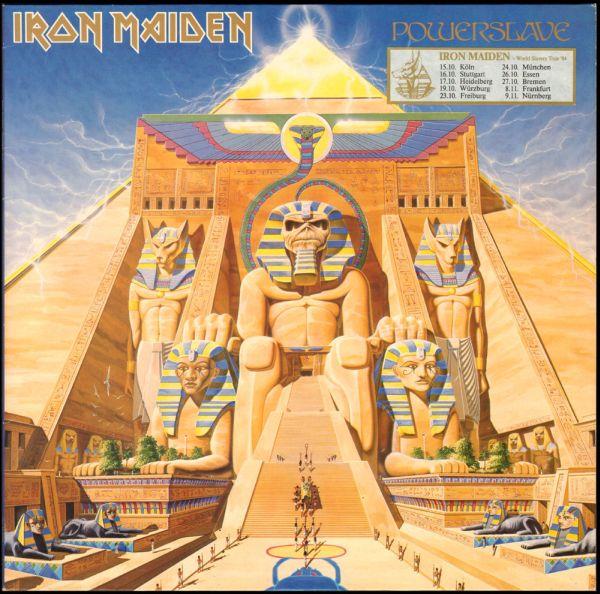 Обложка альбома Powerslave, разработанная постоянным оформителем группы Дереком Риггсом, среди прочих древнеегипетских элементов содержит некоторые иероглифы, которые относятся к нашему времени: