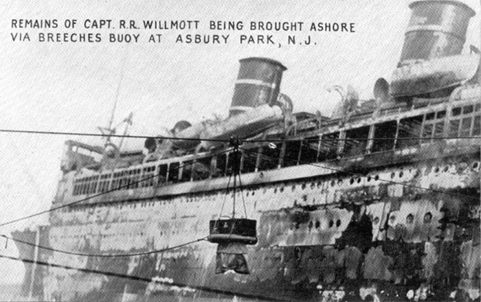 К трем часам утра пожар на корабле достиг кульминации. "Морро Касл", по словам очевидцев, напоминал огромный нефтяной факел, он пылал с носа и до самой кормы, и тем не менее на его борту все еще оставалась горстка людей, пытавшихся спасти свое судно. Это был капитан Уормс, два радиста и несколько офицеров. Когда пламя начало стихать, они попытались отдать один из якорей, чтобы прекратить дрейф неуправляемого и безжизненного судна под ветер и не дать ему разбиться о скалы, которыми изобиловало нью-джерсийское побережье. Однако жвака-галс якорной цепи заклинило, и "Морро Касл" стало неотвратимо сносить к берегу.