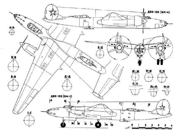 Следует сказать о разработке ряда модификаций ДВБ-102 под двигатели М-20 (дизеля), МБ-100, М-82 и АШ-73, в том числе в проекте дальнего рекордного самолета. Но ни один из этих вариантов не был реализован. Однако многие смелые идеи, заложенные в этом интересном для своего времени самолете, прослеживаются в последующих работах коллектива В. М. Мясищева. В частности, в созданных им проектах тяжелых четырехмоторных бомбардировщиков ДВБ-202 и ДВБ-302, по своим расчетным характеристикам значительно превосходивших американский Б-29, Но И. В. Сталин принял решение полностью скопировать Б-29 с нескольких имевшихся натурных образцов.